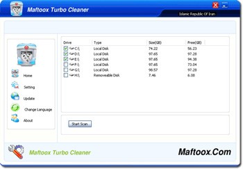 Với giao diện đơn giản và trực quan, Maftoox Turbo Cleaner cho phép người dùng dễ dàng lựa chọn các ổ đĩa cần quét. Sau khi chọn, chỉ cần nhấn nút "Start Scan" để khởi động quá trình tìm kiếm và loại bỏ các tập tin rác.