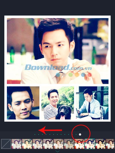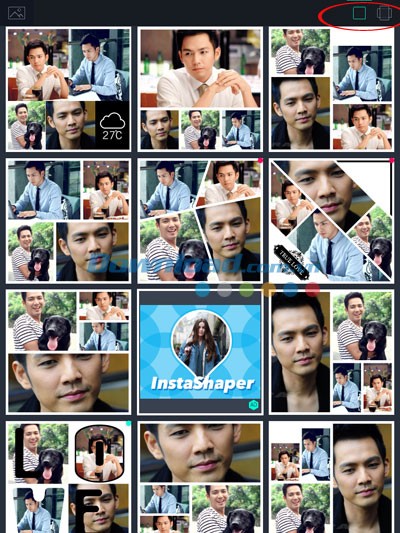 Tiếp theo, các hình ảnh này sẽ được tự động sắp xếp vào các bố cục (layout) được thiết kế sẵn, với định dạng ảnh vuông, lý tưởng để chia sẻ đầy đủ trên Instagram hoặc ảnh dọc. Tất cả các bố cục ghép ảnh sẽ được hiển thị trên một màn hình duy nhất, cho phép bạn dễ dàng chọn lựa và chuyển sang bước chỉnh sửa.