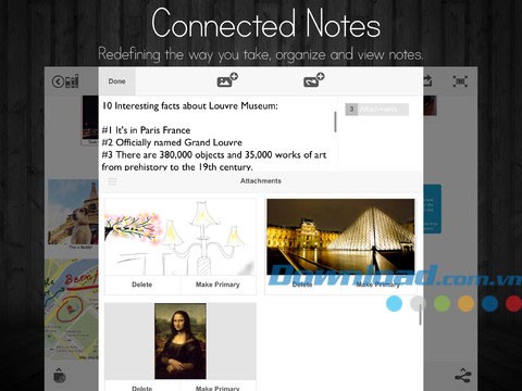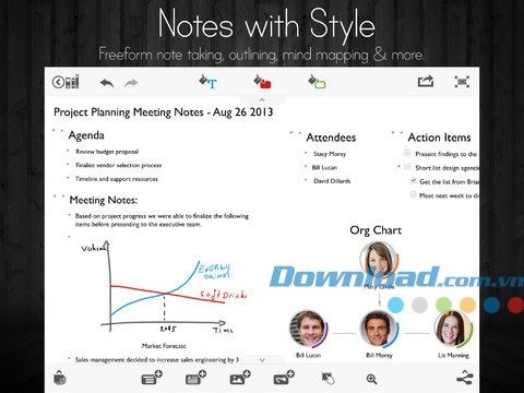 Làm cho ghi chú của bạn trở nên sinh động hơn bằng cách thêm hình ảnh từ thư viện đa phương tiện của hệ thống hoặc chụp trực tiếp bằng camera iPad. Chèn các hình vẽ để hoàn thiện ghi chú của bạn, thay đổi kích thước hoặc vẽ trực tiếp lên ảnh để tạo ra những khuôn hình hoàn hảo. Bạn có thể bổ sung ghi chú, đính kèm các hình vẽ liên quan và hình ảnh để kết nối chúng thành một tổng thể hài hòa.