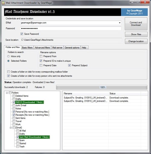 Từ màn hình chính của phần mềm, người dùng thực hiện đăng nhập vào tài khoản email của mình. Sau đó, chương trình sẽ tiến hành tải về tất cả các tệp đính kèm có trong hộp thư đến. Tuy nhiên, bạn hoàn toàn có thể tùy chỉnh việc tải về theo định dạng tập tin cụ thể bằng cách sử dụng các tùy chọn có sẵn trong thẻ Basic filters.