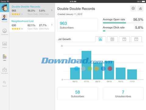 Theo dõi sự phát triển của danh sách khách hàng, tìm người đăng ký mới gần vị trí hiện tại, lọc theo nhóm và tìm những người có mối liên hệ chặt chẽ nhất với MailChimp for iOS.