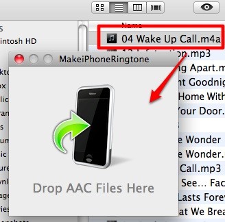 Để tạo nhạc chuông, bạn cần chuẩn bị một đoạn nhạc AAC có thời lượng dưới 40 giây. Sau đó, mở MakeiPhoneRingtone và kéo đoạn nhạc vào ứng dụng, nếu thành công, bạn sẽ tìm thấy file nhạc chuông trong thư mục nhạc chuông của iTunes.
