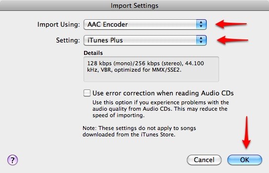 Trong mục Import Using, hãy chọn AAC Encoder và chọn chất lượng “iTunes Plus” ở mục Setting để đảm bảo chất lượng âm thanh tốt nhất.