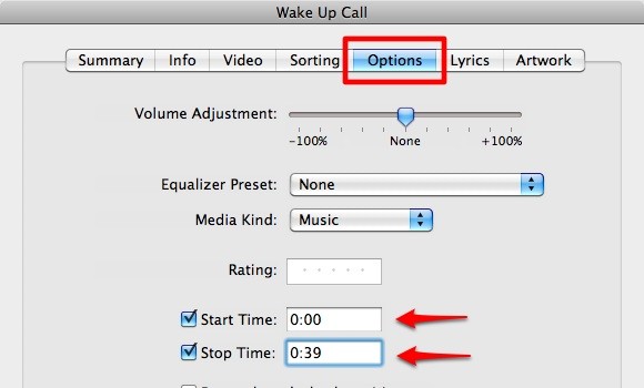 Bạn cần chọn bài hát đã chuyển đổi sang định dạng AAC, sau đó chuột phải và chọn Get Info. Trong tab Options, hãy điều chỉnh thời gian bắt đầu và kết thúc đoạn nhạc theo ý muốn, giới hạn trong khoảng 40 giây.