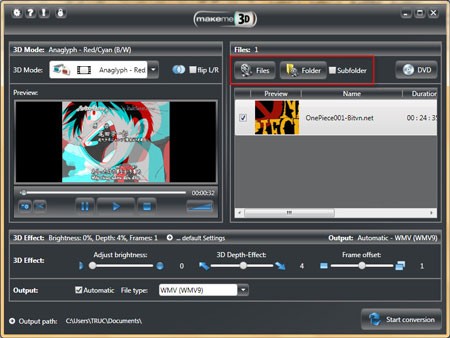 Sau khi chọn định dạng, giao diện MakeMe3D sẽ tự động chuyển sang chế độ 3D, cho phép bạn vừa đeo kính vừa điều chỉnh video để có được kết quả ưng ý nhất. Khung Preview sẽ phát lại bộ phim dưới định dạng 3D để bạn có thể theo dõi trực tiếp.