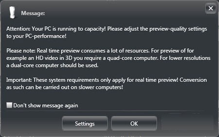 Tuy nhiên, để xem video 3D ở chất lượng cao nhất, máy tính của bạn cần được trang bị CPU bốn nhân. Nếu cấu hình máy tính thấp hơn, một thông báo Your PC is running to capacity có thể xuất hiện, yêu cầu bạn giảm chất lượng xem thử video. Bạn có thể nhấn Settings để thực hiện điều chỉnh.