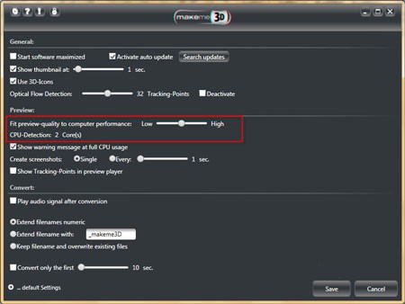 Tại mục Fit preview-quality to computer performance, bạn có thể kéo thanh trượt từ High xuống mức Low hoặc Medium để giảm tải cho máy tính. Mục CPU-Detection hiển thị số lượng nhân CPU trên máy tính của bạn.