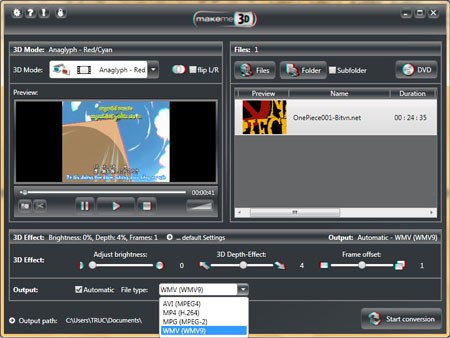 Cuối cùng, nhấp chuột vào dòng Output path và chọn thư mục lưu phim 3D (mặc định là C:\Users\Tên người dùng\Documents), sau đó nhấn Start conversion để bắt đầu quá trình chuyển đổi.