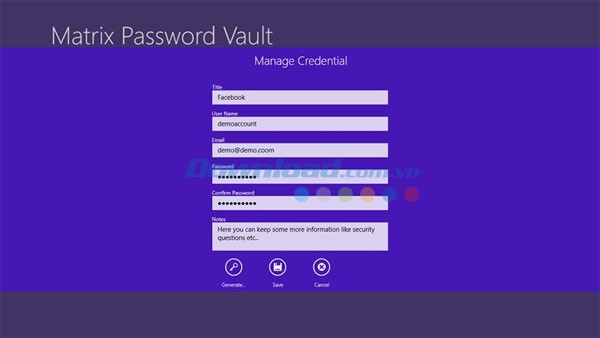 Bên cạnh chức năng bảo mật mật khẩu và tài khoản truy cập, Matrix Password Vault còn hỗ trợ tạo mật khẩu mạnh và an toàn cho nhiều loại tài khoản khác nhau. Bao gồm tài khoản Email, các ứng dụng chat, tài khoản truy cập website và các nền tảng mạng xã hội. Tất cả thông tin này sẽ được lưu trữ trong một thư mục chung.