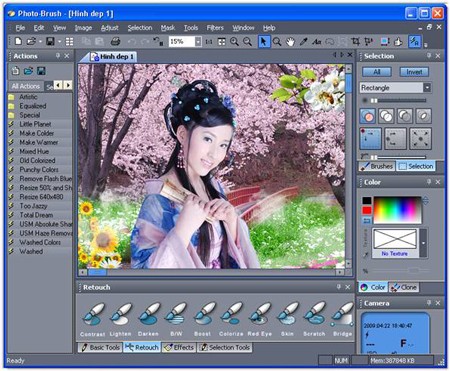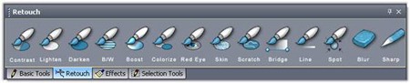 Nhóm công cụ Retouch cung cấp các công cụ mạnh mẽ để chỉnh sửa ảnh, bao gồm: Contrast – tăng độ tương phản, Lighten – tăng độ sáng, Darken – giảm độ sáng, B/W – chuyển về đen trắng, Colorize – làm mềm màu sắc, Red Eye – khử hiệu ứng mắt đỏ, Scratch – làm mịn các đường nét, Line – vẽ đường sọc mờ, Blur – tạo hiệu ứng bóng mờ.