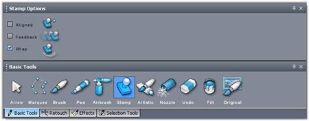 Công cụ Stamp là một trợ thủ đắc lực trong việc loại bỏ các chi tiết không mong muốn trên ảnh. Trong khung Stamp Options, bạn có thể tùy chọn Aligned (giữ nguyên vị trí mẫu màu nguồn) hoặc bỏ chọn (mẫu màu nguồn trở về vị trí ban đầu), Feedback (vẽ mẫu màu nguồn gián đoạn), và Wrap (màu chọn thay đổi theo vị trí chuột).