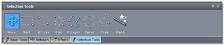 Nhóm công cụ Selection Tools giúp bạn lựa chọn vùng ảnh theo các hình dạng khác nhau: Rect – hình chữ nhật bo tròn, Ellipse – hình elip, Star – hình ngôi sao, Polygon – đa giác, Curve – đường cong kín, Free – đường cong hở và kín, Wand – vùng chọn theo gợi ý. Kết hợp các công cụ này với các tính năng khác, bạn sẽ tạo ra những vùng ảnh với hiệu ứng như mong muốn.