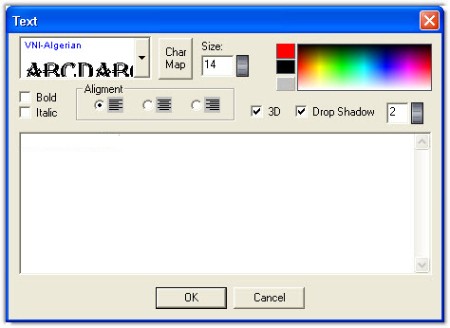 Để chèn văn bản vào ảnh, hãy nhấn vào biểu tượng Add Text (chữ Aa) và chọn vị trí cần chèn. Trong cửa sổ hiện ra, bạn chọn font chữ, kích thước, hiệu ứng (Bold, Italic, 3D, Drop Shadow). Để nhập tiếng Việt có dấu, hãy chọn các font VNI.