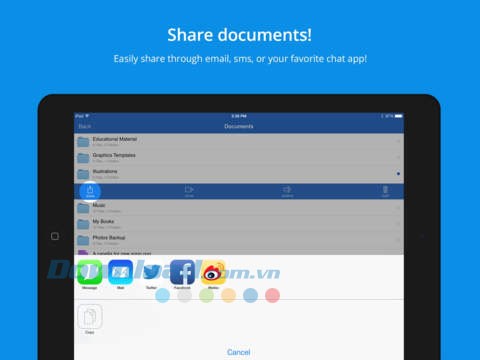 Chia sẻ tập tin trở nên đơn giản hơn bao giờ hết, chỉ cần sao chép liên kết và gửi qua email, tin nhắn SMS, Facebook, Twitter hoặc Weibo.