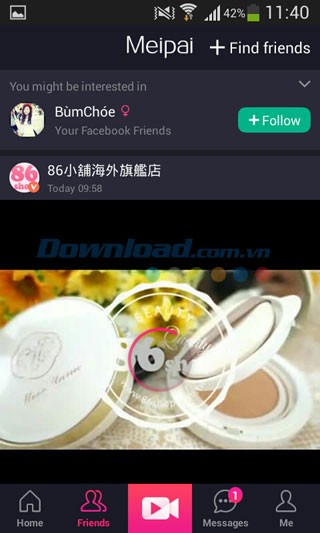 Meipai sẽ tự động tìm kiếm bạn bè trên Facebook đang sử dụng ứng dụng này. Bạn có thể theo dõi họ bằng cách nhấn vào nút "Follow".