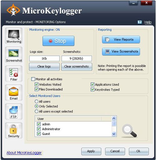 Micro Keylogger chạy âm thầm trong nền, liên tục giám sát các hoạt động trên máy tính của bạn. Ứng dụng này cho phép bạn theo dõi một cách kín đáo tất cả các thao tác của người dùng. Bạn có thể nắm bắt được những gì con cái hoặc đồng nghiệp đang thực hiện trên máy tính, đồng thời tạo một bản sao lưu dữ liệu đã nhập với Micro keylogger.