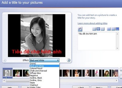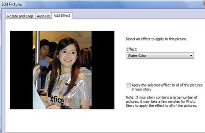 Hộp thoại Edit Pictures sẽ xuất hiện. Tại đây, bạn có thể tùy chọn xoay hình, cắt hình để phù hợp với khung hình (bằng cách tích vào tùy chọn Crop) hoặc thêm hiệu ứng (chọn tab Add Effect và chọn hiệu ứng mong muốn). Bạn có thể áp dụng hiệu ứng cho tất cả hình ảnh bằng cách đánh dấu vào mục Apply the selected effect to all the pictures in your story. Chương trình cũng cung cấp tính năng khử mắt đỏ cho ảnh.