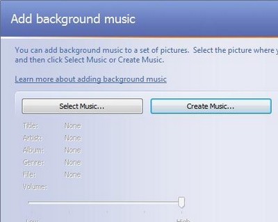 Bây giờ, chương trình sẽ cho phép bạn chọn nhạc nền cho slideshow. Bạn có thể chọn nhạc từ file nhạc riêng (nhấn Select Music) hoặc chọn nhạc từ danh sách chương trình cung cấp (nhấn Create Music).