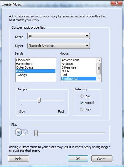 Nếu slideshow được tạo để chia sẻ với gia đình hoặc bạn bè, bạn có thể sử dụng nhạc riêng. Tuy nhiên, nếu slideshow phục vụ mục đích công việc hoặc học tập, bạn nên chọn nhạc do chương trình cung cấp. Khi nhấn vào nút Create Music, một hộp thoại mới sẽ xuất hiện với các tùy chọn.