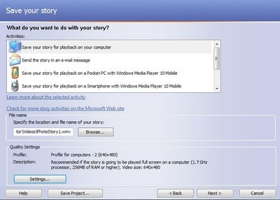 Sau khi chọn nhạc, nhấn Next để chuyển sang bước cuối cùng. Tại bước này, bạn có thể chọn định dạng để lưu slideshow dưới dạng file video, gửi qua email hoặc lưu trên các thiết bị giải trí di động. Nên chọn lưu trên máy tính để có chất lượng hình ảnh và âm thanh tốt nhất. Nhấn nút Browse để chọn vị trí lưu file, nhấn Settings để thay đổi các thuộc tính (nếu cần), và cuối cùng nhấn Next để bắt đầu quá trình lưu.