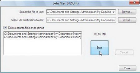 Đối với các file lớn được chia nhỏ bằng HJSplit, Mipony cung cấp tiện ích Join Files để nối lại chúng một cách nhanh chóng. Nhấn nút Join Files trên giao diện, chọn file cần nối bằng nút Browse, chỉ định thư mục lưu file kết quả bằng nút Browse khác, và nhấn Start để bắt đầu quá trình nối file.