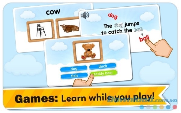 Các thể loại game đơn giản như chọn từ phù hợp với ảnh, chọn ảnh phù hợp với nghĩa của từ, hoặc chỉ vào từ mà ứng dụng vừa đọc sẽ giúp trẻ ghi nhớ bài học và từ vựng lâu hơn.