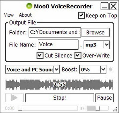 Moo0 VoiceRecorder cho phép bạn ghi lại giọng nói một cách nhanh chóng, chỉ với một thao tác duy nhất. Hiện tại, phần mềm này hỗ trợ định dạng mp3 để mã hóa các bản ghi âm.