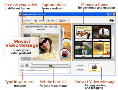 Movavi Videomessage mang đến giải pháp đơn giản để bạn tạo ra những bưu thiếp điện tử độc đáo và ý nghĩa. Phần mềm cho phép bạn sử dụng các đoạn video ngắn vui nhộn, được ghi lại trong những chuyến đi hoặc các buổi gặp mặt gia đình, từ máy quay cầm tay, webcam hay thậm chí là điện thoại di động, để gửi tặng bạn bè và người thân ở xa qua email.