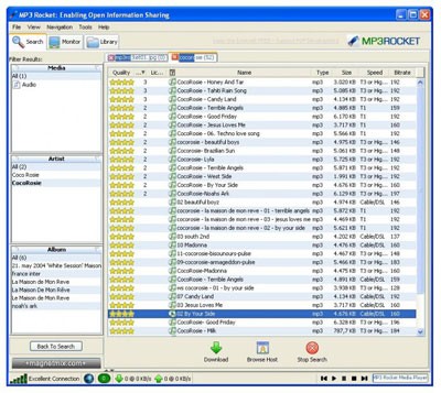Các file torrent được chia sẻ sẽ được liệt kê chi tiết ở trung tâm giao diện. Bạn có thể xem thông tin về các file torrent đang được quan tâm và tải về (Top Torrent Downloads), bao gồm tên file (Name), phân loại (Category) và dung lượng (Size). Để tìm kiếm những nội dung cụ thể hơn, hãy duyệt qua cửa sổ Category ở bên trái, nơi giới thiệu 200 file được tải về nhiều nhất thuộc nhiều lĩnh vực khác nhau. Sau khi tìm thấy file cần thiết, nhấp vào tên file và nhấn nút Download. Một cửa sổ xác nhận sẽ hiện ra, hãy nhấn OK. MP3 Rocket sẽ tự động tìm kiếm các host có băng thông mạnh nhất để tải file về cho bạn.