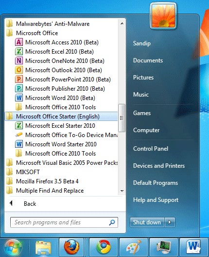Sau khi cài đặt hoàn tất, kết nối ổ USB với máy tính. Truy cập Start menu > All Programs > Microsoft OfficeStarter (English) để xem tất cả các ứng dụng của Microsoft Office 2010 Starter Beta, bao gồm cả Microsoft Office To-Go Device Manager 2010 (Beta).