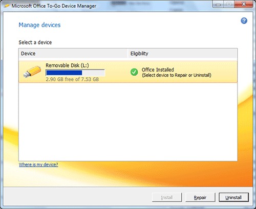 Khi quá trình hoàn tất, bạn sẽ được chuyển đến hộp thoại Manage Devices. Tại đây, hãy chọn ổ USB mà bạn muốn cài đặt Microsoft Office 2010 Starter Beta (chiếm khoảng 338MB) và nhấn Install.