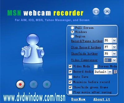 MSN Webcam Recorder tương thích và hỗ trợ quay video màn hình trong quá trình sử dụng các phần mềm giao tiếp thông dụng như AIM, ICQ , MSN, và Yahoo Messenger .