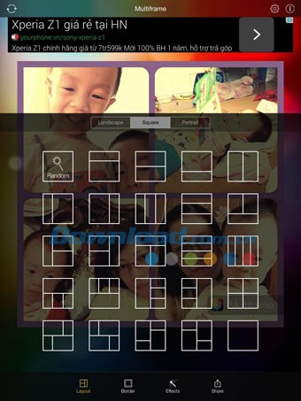 Để thay đổi khung ảnh, chọn mục Layout và chọn một trong 75 bố cục ảnh có sẵn. Bạn cũng có thể chọn bố cục ngẫu nhiên trong các mục Landscape, Square hoặc Portrait.