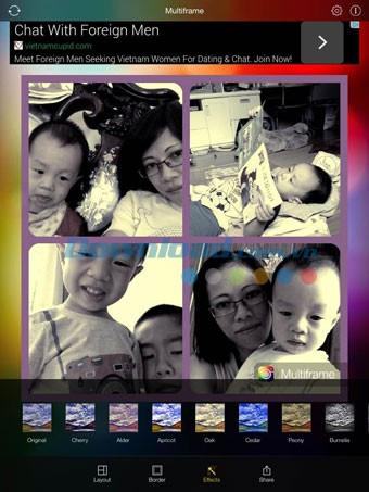 Multiframe cung cấp 11 bộ lọc ảnh trong phần Effect – một con số khá ít so với các ứng dụng chỉnh sửa ảnh khác. Các bộ lọc này không quá nổi bật. Ưu điểm là ứng dụng cho phép áp dụng hiệu ứng cho từng ảnh riêng lẻ hoặc toàn bộ bố cục.