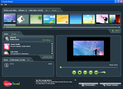 muvee Reveal giúp bạn tự động tạo nên những thước phim ấn tượng từ bộ sưu tập ảnh cá nhân. Việc cần làm chỉ là chọn lựa video và hình ảnh mong muốn, sau đó chọn một Style phù hợp với chủ đề. Cuối cùng, hoàn thiện câu chuyện bằng cách sử dụng các thiết kế chuyên nghiệp, lựa chọn phông chữ và thêm chú thích.
