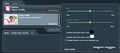 Khu vực thứ hai cung cấp 10 hiệu ứng hình ảnh đẹp mắt cho album. Bạn có thể chọn một kiểu và nhấn Play để xem trước. Để tùy chỉnh tốc độ, màu sắc, hình ảnh, hình nền của hiệu ứng, chọn Style Settings. Mỗi hiệu ứng có các tùy chọn riêng biệt. Reset to Default sẽ khôi phục về cài đặt gốc.