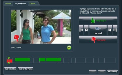 Thẻ magicMoment cho phép cắt bỏ hoặc chọn những đoạn quan trọng (Highlight) trong video. Các đoạn Highlight sẽ được ưu tiên xuất hiện nếu độ dài album ngắn hơn video. Nhấn Play, Exclude để bỏ đoạn, Highlight để chọn đoạn và Unmark để bỏ đánh dấu.