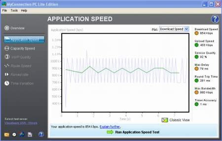Với chế độ Classic View như hình minh họa, MyConnection PC sẽ hiển thị tốc độ tải xuống và tải lên của đường truyền, ví dụ như 854 Kbps và 433 Kbps. Đồng thời, chương trình ước tính thời gian tải các tập tin có dung lượng khác nhau, chẳng hạn như 1Mb trong 10 giây, 10Mb trong 2 phút, 100Mb trong 16 phút, hoặc một CD nhạc trong 1,6 giờ.