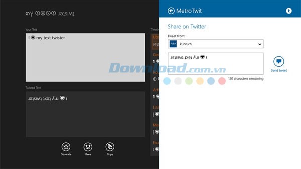 MyTextTwister for Windows 8 là một ứng dụng nhắn tin sáng tạo, miễn phí dành cho hệ điều hành Windows 8. Ứng dụng mang đến trải nghiệm bất ngờ cho người dùng thông qua các tin nhắn ký tự độc đáo và dễ thương.