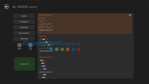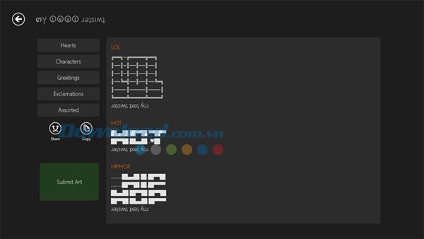 Ứng dụng cung cấp nhiều mẫu tin nhắn xếp hình được tạo sẵn, cho phép người dùng lựa chọn theo sở thích. Đừng quên sử dụng Submit Art để chia sẻ các mẫu tin nhắn xếp hình độc đáo mà bạn khám phá với cộng đồng MyTextTwister.
