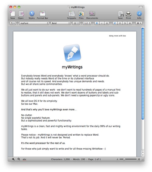 myWritings của MOApp được phát triển như một công cụ xử lý văn bản dành cho tất cả người dùng. Phần lớn mọi người đều quen thuộc với Microsoft Word và hiểu rõ các chức năng cơ bản của việc xử lý văn bản. Tuy nhiên, không phải lúc nào và ở đâu chúng ta cũng cần đến Word với giao diện phức tạp và tốc độ xử lý đôi khi chậm chạp.