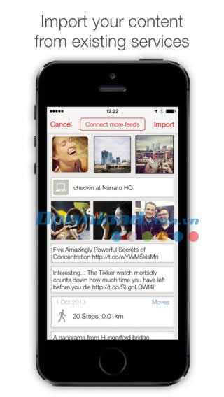 Với tính năng Narrato LifeStream, bạn có thể nhập dữ liệu từ nhiều dịch vụ khác nhau mà bạn thường xuyên sử dụng, bao gồm các mạng xã hội phổ biến như Facebook , Twitter , Instagram , Foursquare , Moves và App.net.