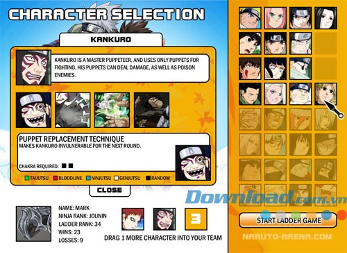 Hoàn thành nhiệm vụ sẽ giúp bạn mở khóa các Ninja mạnh mẽ như Orochimaru, các Kage, Kakashi, Gai... với những kỹ năng siêu việt. Bạn chỉ có thể sử dụng những Ninja này khi tham gia các trận đấu Ladder ở cấp độ cao. Nếu bạn muốn trải nghiệm game một mình, hãy chọn chế độ Private Game và nhập ID của người chơi khác để thách đấu.
