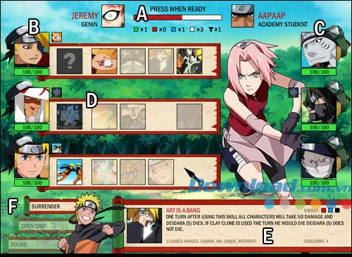 Game Naruto Arena mang đến lối chơi chiến đấu theo lượt (turn-based) đầy thú vị. Chiến thắng sẽ thuộc về bạn khi bạn đánh bại toàn bộ đội hình đối phương hoặc khiến họ phải đầu hàng.