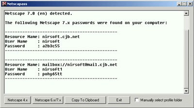 Netscape 4x: Thay vì sử dụng Registry, Netscape 4x lưu trữ thông tin người dùng trong một tập tin có tên “nsreg.dat”. Nếu chương trình không thể tìm thấy mật khẩu, hãy chọn “Manually select profile folder” và chỉ định thư mục chứa dữ liệu cá nhân của bạn.