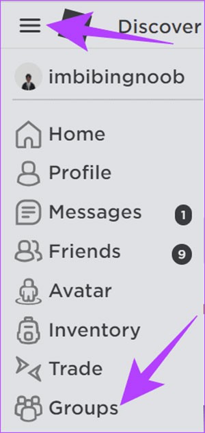 Bước 1: Truy cập Roblox và đăng nhập vào tài khoản cá nhân của bạn. Sau đó, nhấp vào biểu tượng ba đường ngang nằm ở góc phía trên bên phải màn hình và chọn mục Groups.