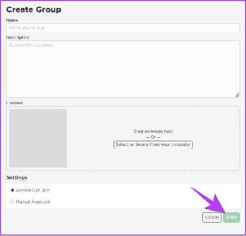 Bước 3: Điền đầy đủ các thông tin cần thiết như tên nhóm, mô tả,... và hoàn tất bằng việc thanh toán 100 Robux để thiết lập nhóm.
