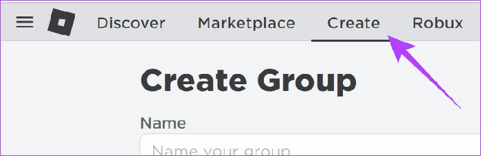 Bước 1: Mở Roblox và chọn Create ở khu vực trên cùng của trang. Trong trang tiếp theo, hãy chuyển sang nhóm của bạn bằng cách sử dụng menu thả xuống.