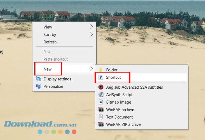 Bước 1: Trên màn hình desktop, hãy nhấp chuột phải vào một vị trí trống, sau đó di chuyển con trỏ chuột đến mục New và chọn Shortcut.