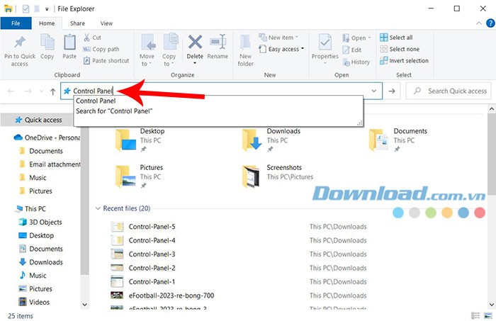 Bước 2: Trong thanh tìm kiếm của File Explorer, nhập từ khóa Control Panel và nhấn phím Enter để thực hiện.